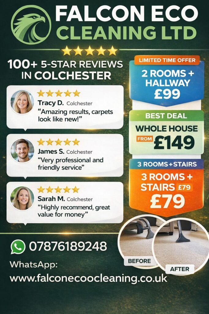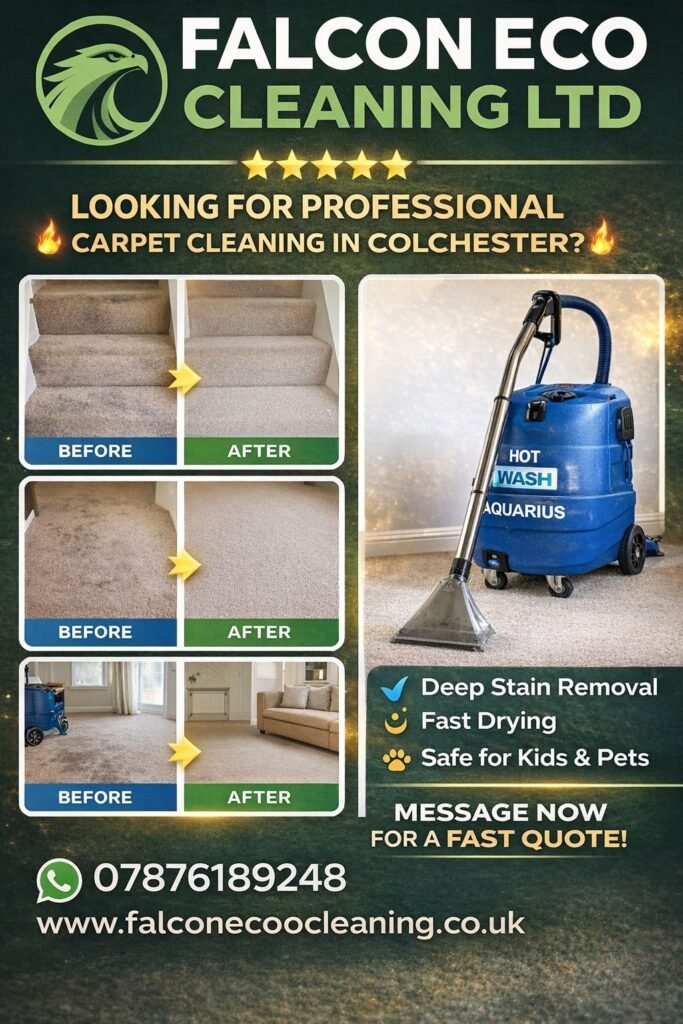 At Falcon Eco Cleaning Ltd, we provide professional cleaning services in Essex and London, delivering exceptional results for both residential and commercial clients. Our team specializes in eco-friendly cleaning in Colchester, offering everything from regular home maintenance to specialist services like carpet cleaning from £30.