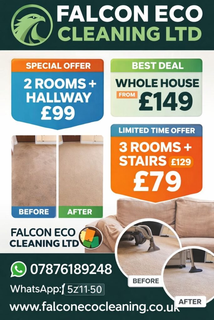 Starting from just £30, our carpet and upholstery cleaning service breathes new life into your soft furnishings. Using professional steam cleaning equipment and eco-friendly solutions, we remove deep-seated dirt, stains, and odours. Our fast-drying process means minimal disruption to your daily routine.